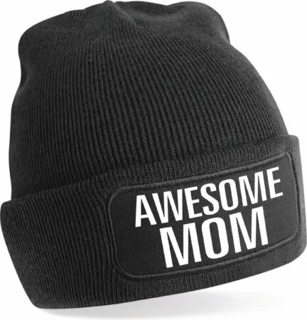Muts awesome mom / geweldige moeder zwart voor dames – Winter accessoires. Muts bedrukt met: awesome mom. Leuke muts voor kouden dagen of gewoon om te dragen op een wintersport vakantie. Ook leuk om cadeau te doen voor bijvoorbeeld Moederdag, verjaardag of een andere gelegenheid. De muts is gemaakt van 100% acryl, one size fits all. Kenmerken: