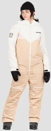 De Mark VI jumpsuit van het hippe merk Oneskee voor dames is het signatuurstuk van het label en de ultieme all-mountain eendelige sneeuwpak, waarin kwaliteitsprestaties samengaan met moderne, ingetogen stijl. Dit ontwerp in wit, zand en roze is gloednieuw. Dit model is geschikt voor alle omstandigheden, met een uitstekende temperatuurregeling voor warmere dagen en prestaties tot -30°C. Alle Oneskee pakken zijn ontworpen en vervaardigd met de perfecte mix van stijl, comfort en prestaties. Voor vakantiegangers tot Olympische profs, voor all-mountain gebruik. EigenschappenOverall van Oneskee gemaakt van ons eigen robuuste, 100 % gerecyclede Snowsense nylon buitenmateriaal met hogere treksterkte, dat nog sterker en scheurbestendiger is100 % gerecycleerde satijnen nylon voering20k/20k waterbestendigheid Ademend vermogenRitssluiting in twee richtingenArm- en beenventilatieVolledig getapete nadenCombinatie van 60/80 gsm bekleding op lichaam, armen en benenTemperatuurregeling Interne bretelsWaterdichte buitenzakken en veilige binnenzak met toegang voor koptelefoonVersterkte stof bij de enkels ter bescherming tegen laarzenSneeuwkappen met antislip elastische bandEnkelritsen met haak en lus sluitingHandschoen clipLycra inzetstukken aan de polsenGemerkte metalen ritsenMet tricot gevoerde kinbeschermerDuurzaam siliconen / rubber merk
